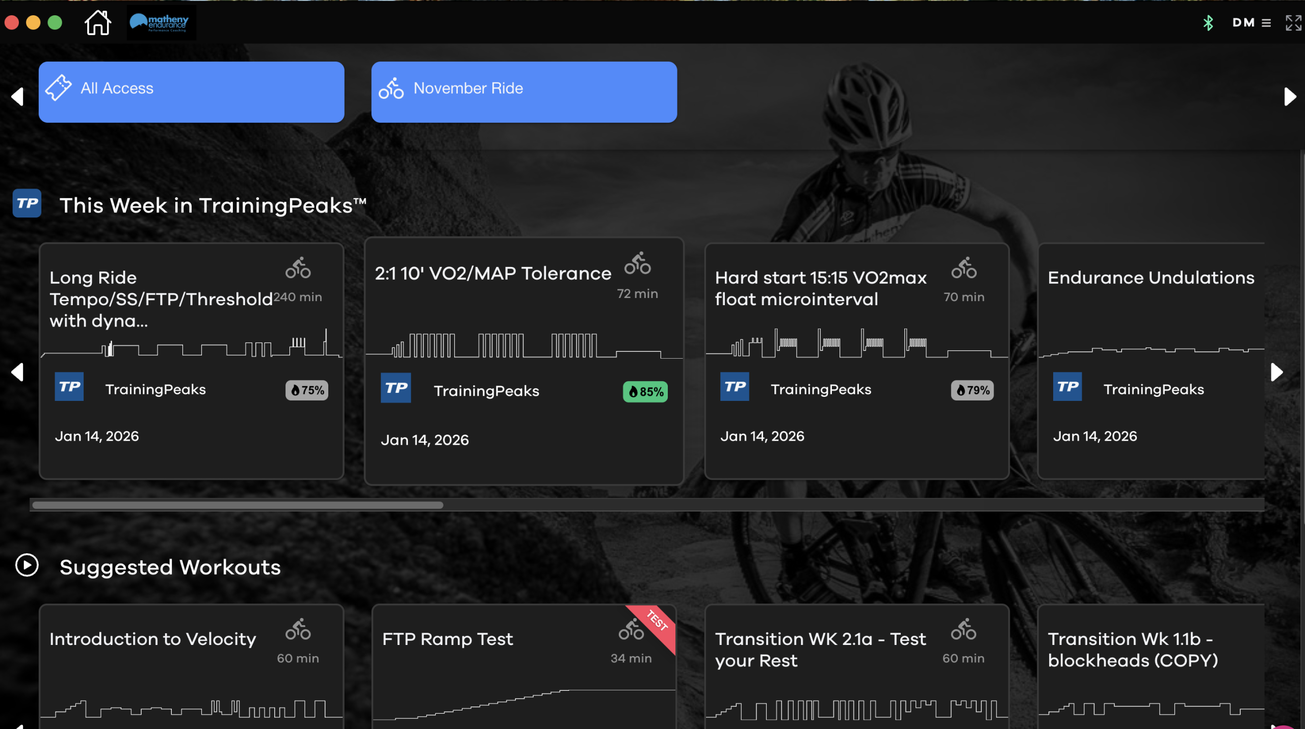 This platform will serve as the athlete’s indoor training ecosystem (and can replace Zwift, TPvirtual, or headunit) for executing workouts. Your upcoming TrainingPeaks workouts sync & will be available front and center when you log in.